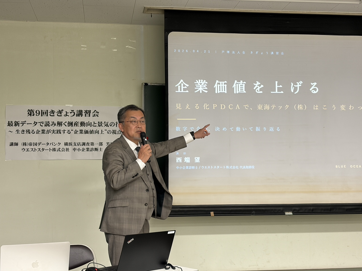 4月21日、戸塚法人会主催のきぎょう講習会に、当社代表・西端望が登壇しました。前半は帝国データバンク・芳賀氏が最新の倒産・景気動向を解説。後半は「企業価値を上げる=生産性を上げること」をテーマに、中小企業が明日から活かせるヒントをお伝えしました。
